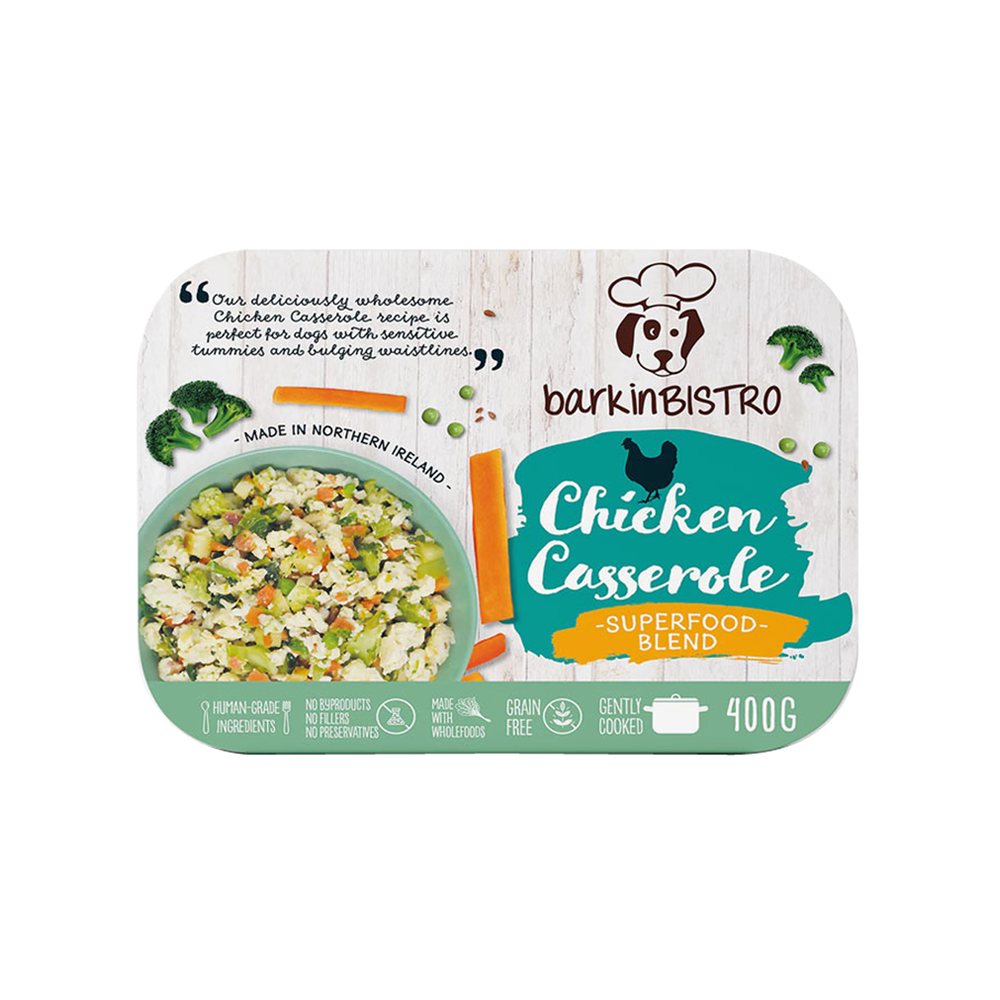 BarkinBISTRO's deliciously wholesome Chicken Casserole recipe is perfect for dogs with sensitive tummies and bulging waistlines. Comprised of 60% fresh human-grade chicken and 40% fresh fruit and vegetables, with the addition of flaxseed oil and turmeric powder and absolutely no nasty ingredients, this classic dish will definitely be appreciated by your happy and healthy dog.