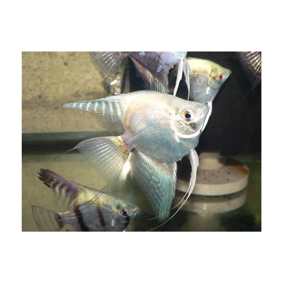 The Blue Angel Angelfish is a striking and elegant variety of freshwater angelfish, a classic staple in the aquarium hobby. At a small size, these juveniles are just beginning to develop the magnificent fins and graceful movements that make them so popular. They are a selectively bred variant of the standard angelfish (Pterophyllum scalare), known for their stunning, deep blue coloration.