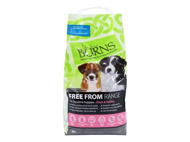 Burns Grain Free Puppy Duck & Potato Dog Food. The complete diet contains high-quality natural ingredients and is designed for pets to thrive. This grain-free diet has been carefully crafted in response to market demand and is developed by Veterinary Surgeon, John Burns.