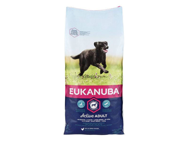 Eukanuba Large Breed Chicken Food for adults (1+ years) is designed to control the growth of your puppy, as it's critical for their proper development to adulthood. Eukanuba is specially formulated to nutritionally support the muscular and skeletal development of large and giant breed adults. Eukanuba Large Breed adult contains precisely balanced levels of calcium, phosphorus, protein and fat to help promote healthy bone growth. It also contains natural sources of Glucosamine and Chondroitin Sulfate and as a whole supports healthy joints.
