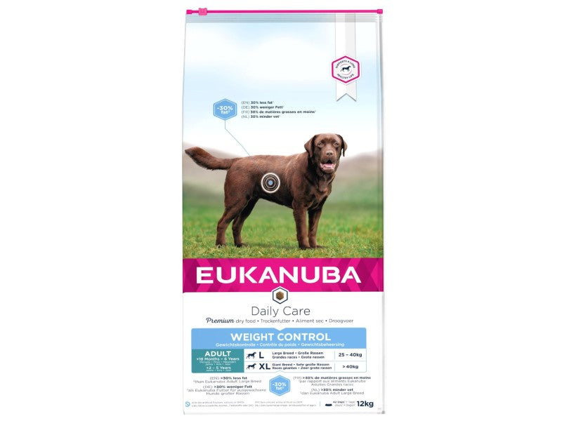 Eukanuba Adult Weight Control Large Breed is for large and giant breed dogs (over 25 kg) with a tendency to be gain weight. It contains 30% less fat (vs. Eukanuba Adult Large Breed) as well as high quality ingredients such as animal based protein, fat, carbohydrates, fibres and important vitamins and minerals for the health and wellbeing of your adult dog.