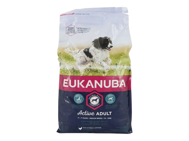 Eukanuba Active Adult Medium Breed rich in fresh chicken 12kg New and improved EUKANUBA life stage recipe, for medium sized active adult dogs aged 1-7 years provides tailored nutrition to support your adult dog's lean muscles and balanced energy levels for optimal body condition.