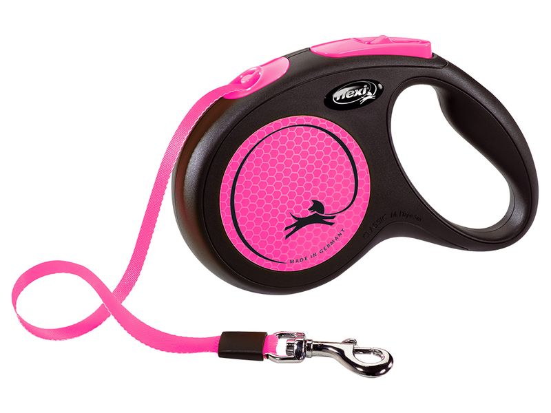 Walk your dog safely and in style with the Flexi Neon Tape Pink Medium 5m retractable lead. Designed for dogs up to 25kg, this vibrant pink lead features highly reflective side panels and neon-coloured components, ensuring superior visibility from up to 160 yards away when illuminated by headlights. The robust 5-meter tape provides your dog with ample freedom to explore while remaining safely connected. Its comfortable braking system allows for immediate control, and it's compatible with Flexi's LED Lighting System and Multi Box (sold separately) for ultimate convenience on every outing.