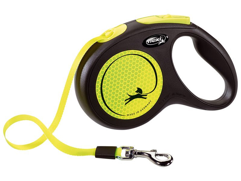 Ensure your dog is seen day or night with the Flexi Neon Tape Yellow Medium 5m retractable lead. Designed for dogs up to 25kg, this vibrant yellow lead features highly reflective side panels and neon-coloured components, ensuring superior visibility from up to 160 yards away when hit by headlights. The sturdy 5-meter tape provides ample freedom for your dog to explore safely, while the comfortable braking system offers immediate control when needed. Plus, it's compatible with Flexi's LED Lighting System and Multi Box (sold separately) for added convenience and safety on every walk.