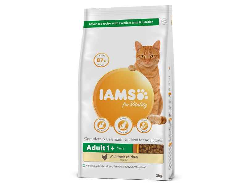 IAMS for Vitality for adult cats is a 100% complete and balanced expert nutrition for your pet to enjoy and thrive on. Our new and improved tasty adult recipe with fresh chicken is based on high quality animal protein, carefully selected to support your cat's 7 signs of healthy vitality. Strongly believing that cats should be healthy, active and full of vitality our tasty recipe contains 87% animal protein (out of total protein).