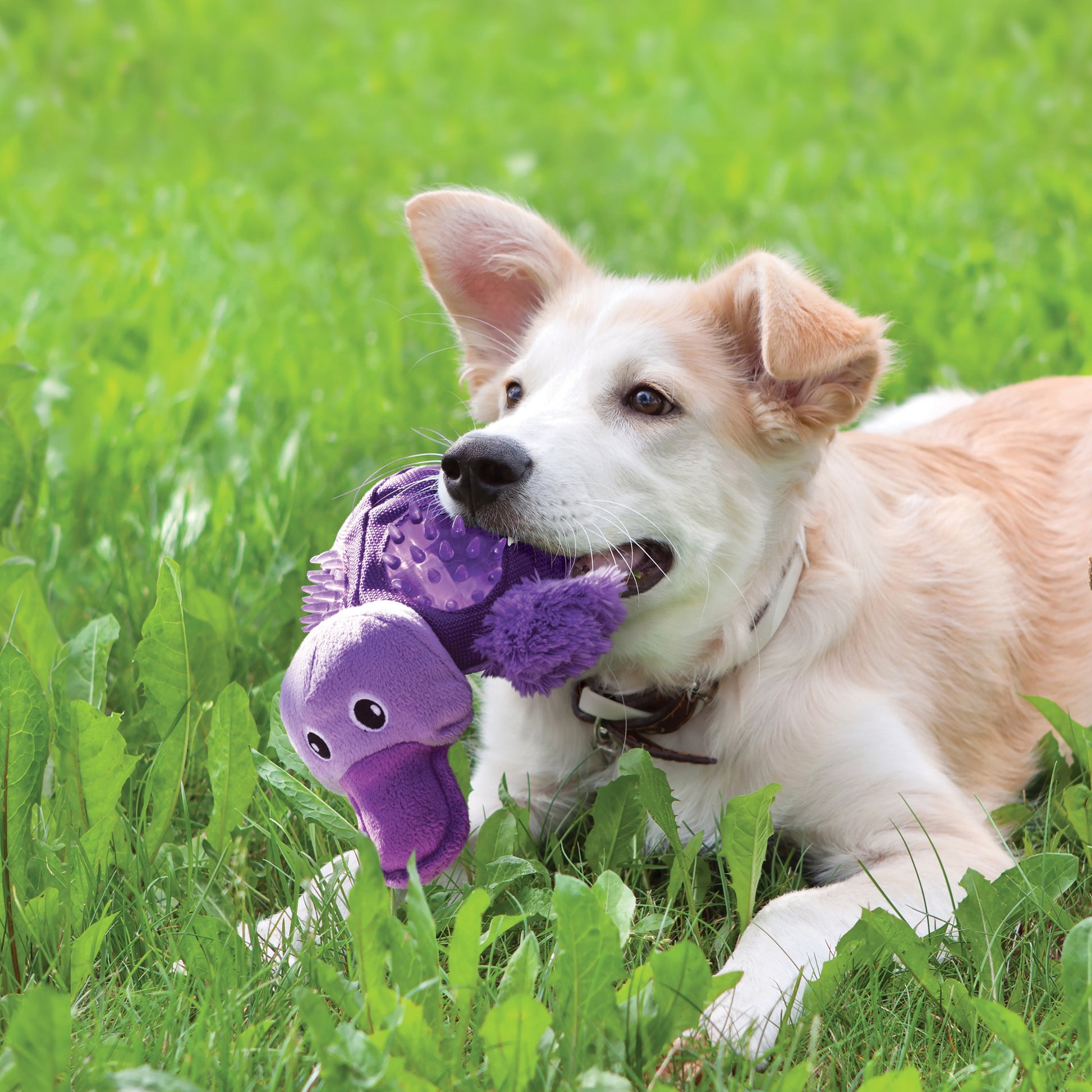 KONG Shells entertain dogs with a buffet of textures that reward with multiple ways to play. Dogs will be intrigued by a tough outer Ballistic shell encased with flexible spikey nubs that fulfill chewing instincts while also cleaning teeth and gums. The inviting squeaker belly adds to the fun.