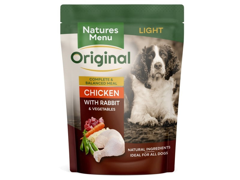 Natures Menu Adult Light Chicken with Vegetables is prepared from whole cuts of meat, fresh vegetables and rice. Because of the 60% meat content each meal is a more nutritious, digestible meal for your dog. Each pouch is filled with top quality chicken, which is an excellent source of essential amino acids that provide the building blocks for muscle development. Each pouch contains the correct balance of vitamins and minerals to help maintain a healthy active life, without any unwanted extras such as soya, wheat, maize or bran.