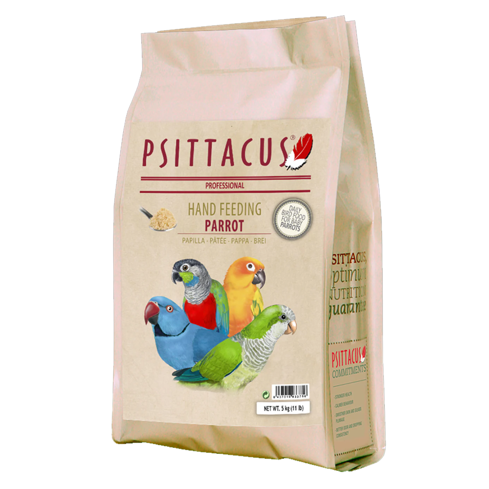 PSITTACUS® PARROT HAND FEEDING FORMULA is a versatile formula for hand-rearing common parrot species like Ring-necked and Asiatic Parakeets, Conures, Quaker Parakeets and Australian parrots (except cockatoos). Not suitable for species with high fat requirements or species belonging to the family Cacatuidae (cockatoos) and the tribe Loriini (lories and lorikeets). It is especially indicated to be used from the moment pin feathers emerge until weaning. It is formulated to constitute 100 % of the baby bird’s daily diet during that period. This will help ensure your baby bird will get all the necessary vitamins, minerals and other nutrients to support growth. PSITTACUS® Parrot Hand Feeding contains the vitamins, minerals and amino acids needed for your baby bird’s health, and thus, no other vitamins or supplements must be offered.