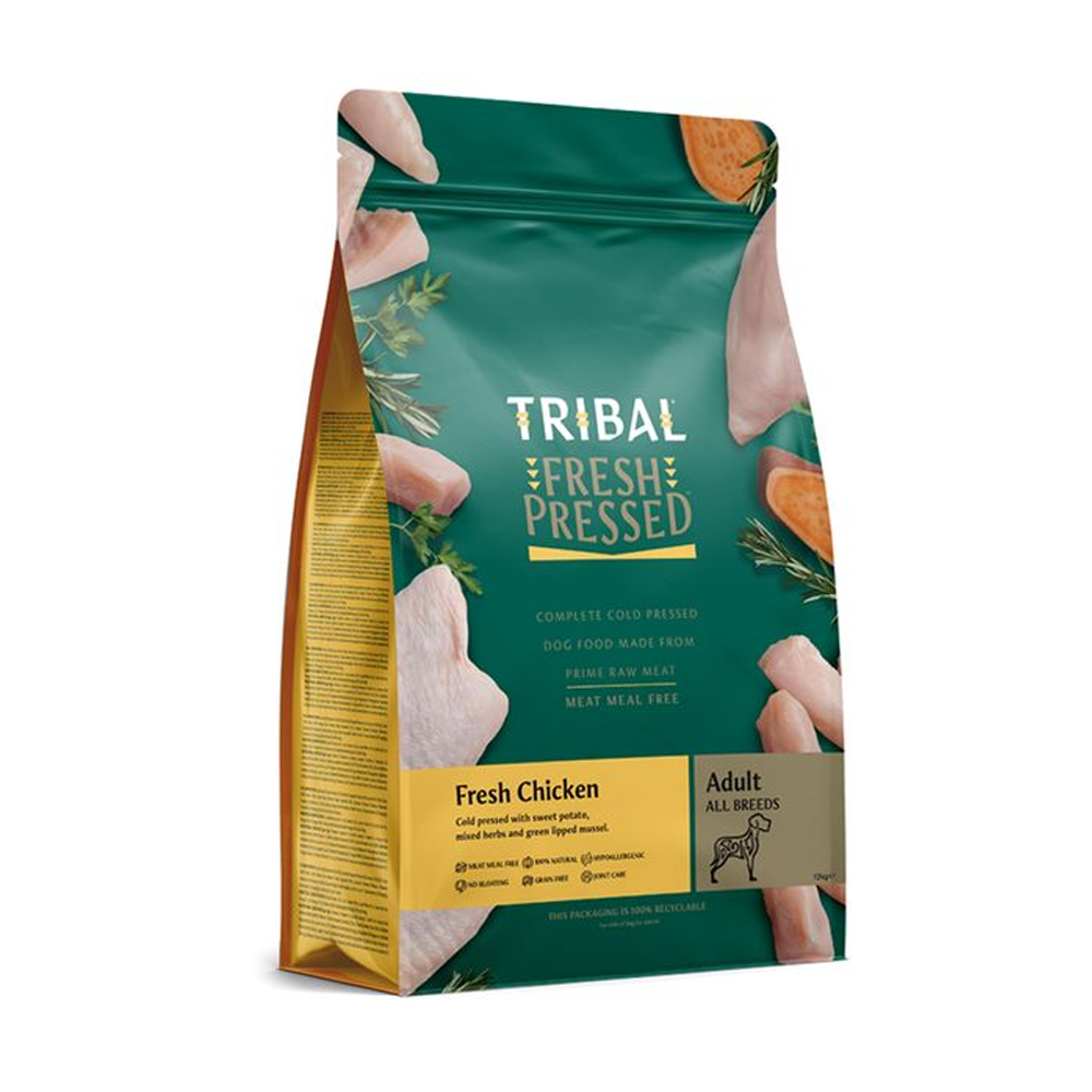 Tribal Fresh-Pressed Adult Food is a cold-pressed food for dogs, made with fresh chicken, sweet potato and mixed herbs, containing only fresh meat and no meat meal, and its grain-free formulation is free from known allergens.