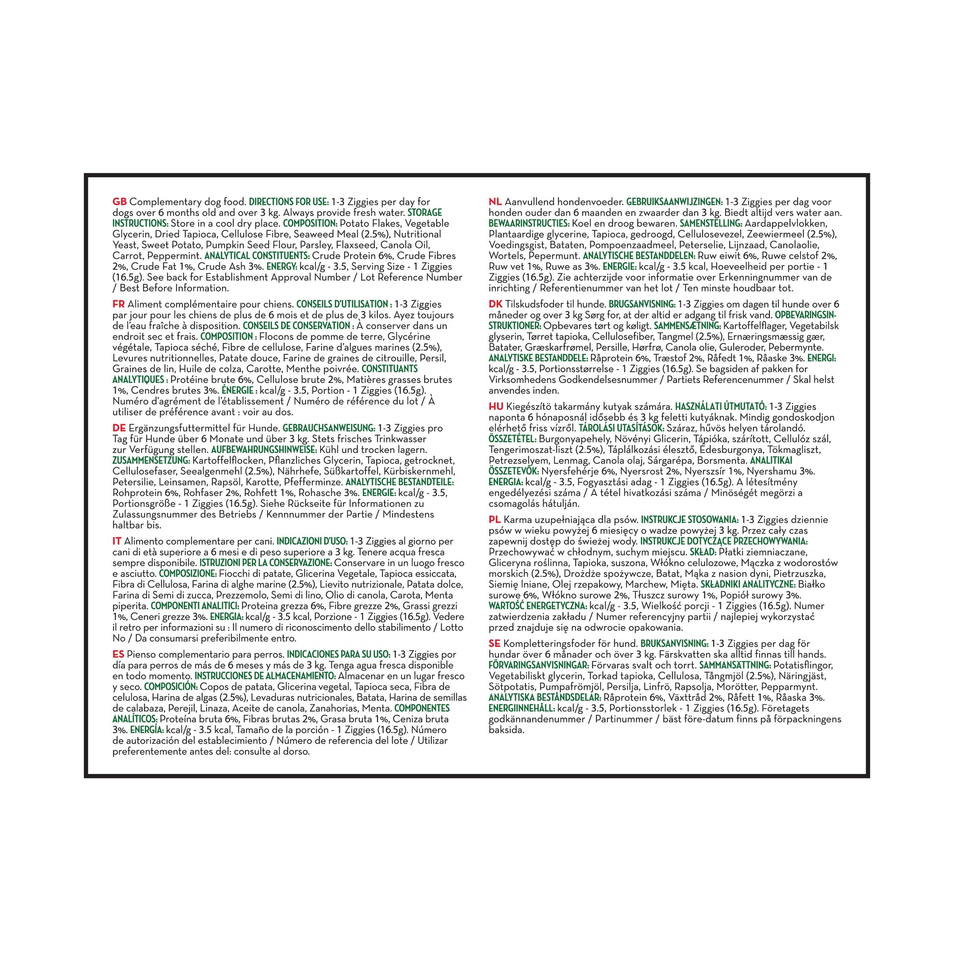 1-3 Ziggies per day for dogs over 6 months old and over 7 kg. Always provide fresh water. Storage instructions: Store in a cool dry place.