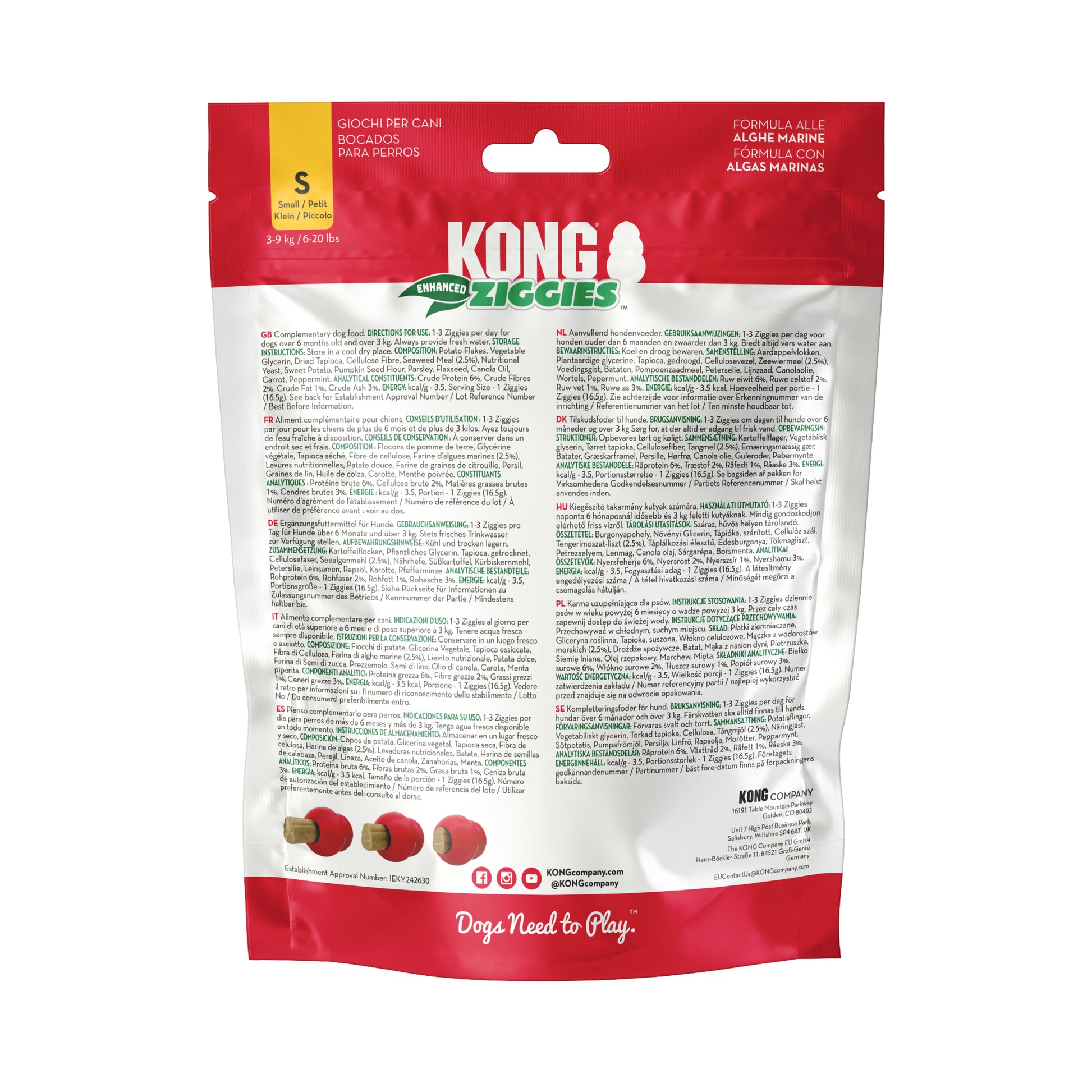 KONG Ziggies naturally delicious chews are specially designed and formulated to support dogs’ oral health. Firm texture and ridges effectively help push away plaque through the mechanical action of chewing, massage gums, and remove leftover food from dogs’ teeth, for fresh breath and bright smiles. With naturally delicious flavor dogs can’t resist, these chews are enriched with PhytoDent™ seaweed that’s packed with antioxidants, vitamins, minerals, and proteins. Plant-based and made without added wheat, corn, or soy, Ziggies are ideal as a treat or for stuffing inside a KONG Classic to extend daily dental care.